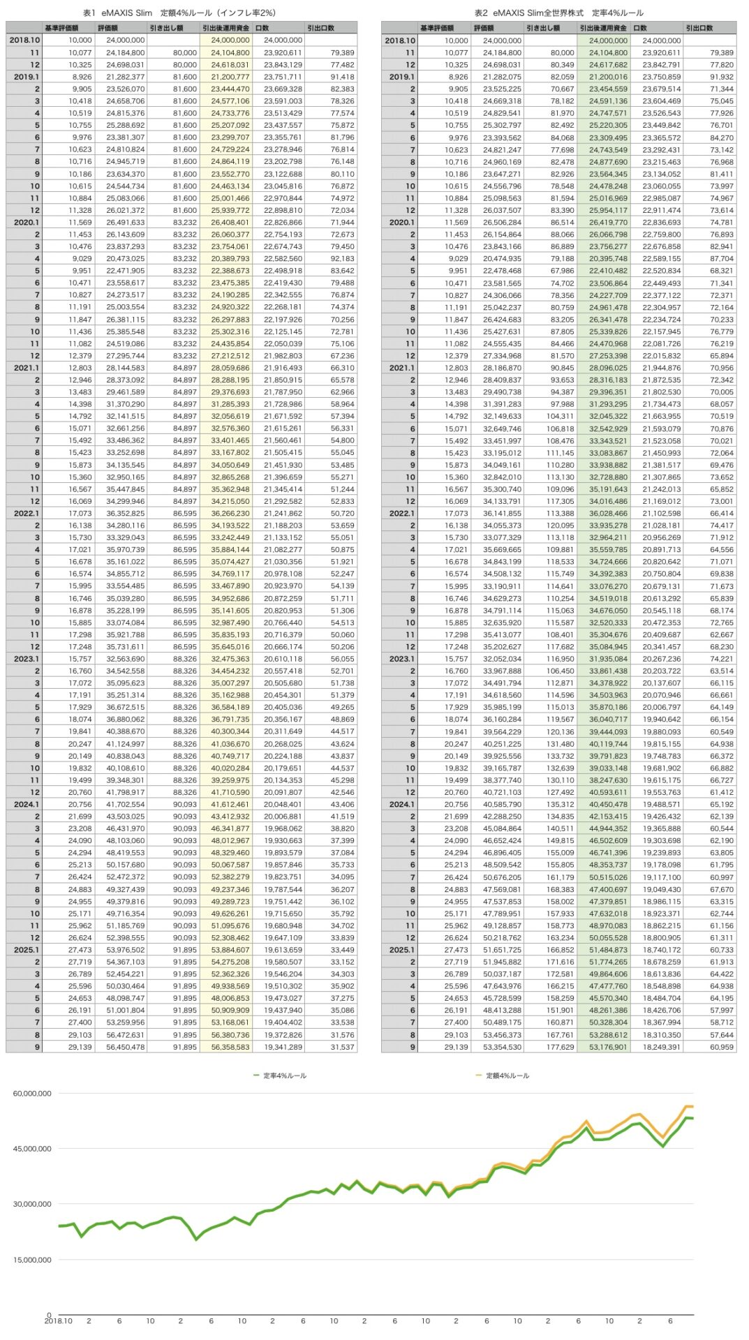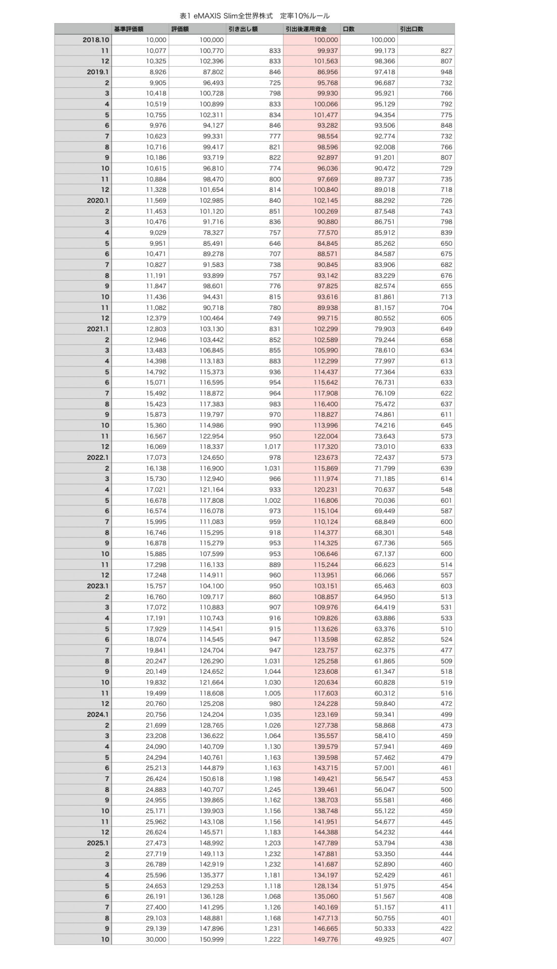 今回は、オルカンの開設来(2018年10月~)の月初日基準価額を使って、4%ルールを検証してみました。